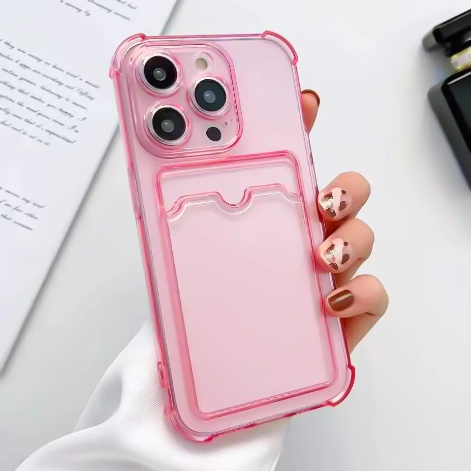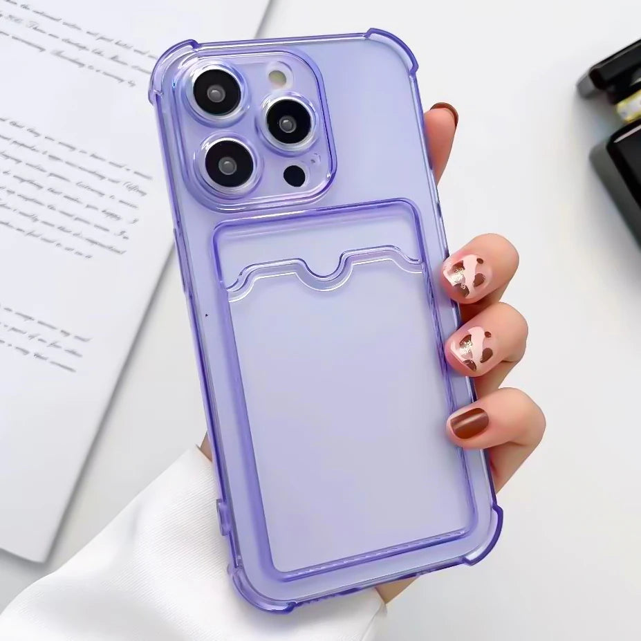 The transparent back showcases your phone's original color, while the reinforced corners absorb shocks from accidental drops. The integrated card slot securely holds one or two cards, allowing you to leave your wallet behind for quick errands or travel.