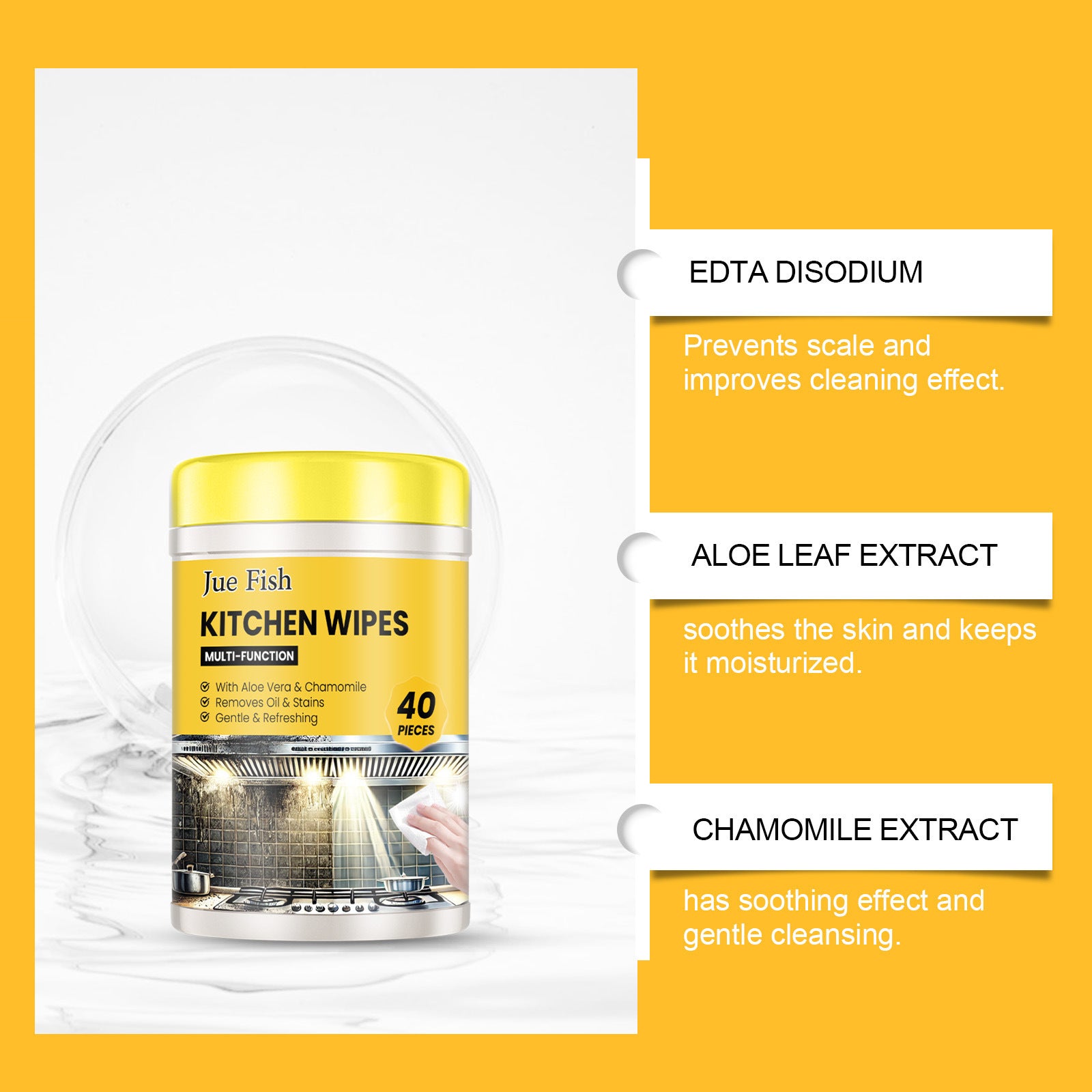 Make everyday kitchen cleaning quicker and easier with these Multifunctional Kitchen Cleaning Wipes. Each pack includes 40 non-woven wet wipes, pre-moistened with a powerful degreasing formula that cuts through grease, oil, food stains, and grime on a variety of surfaces.